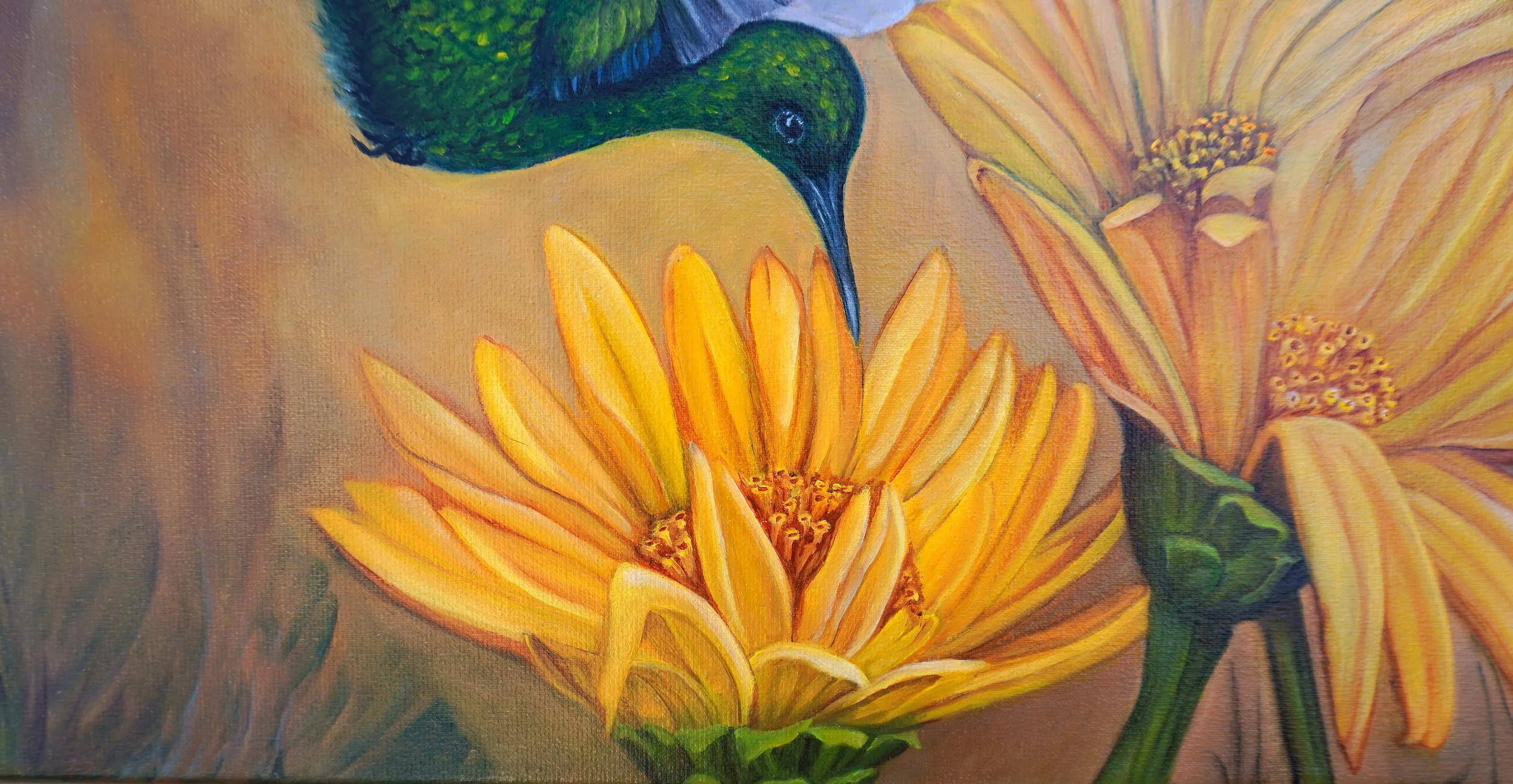 This painting is inspired by a picture of a colibri in Aruba sucking on yellow flowers.